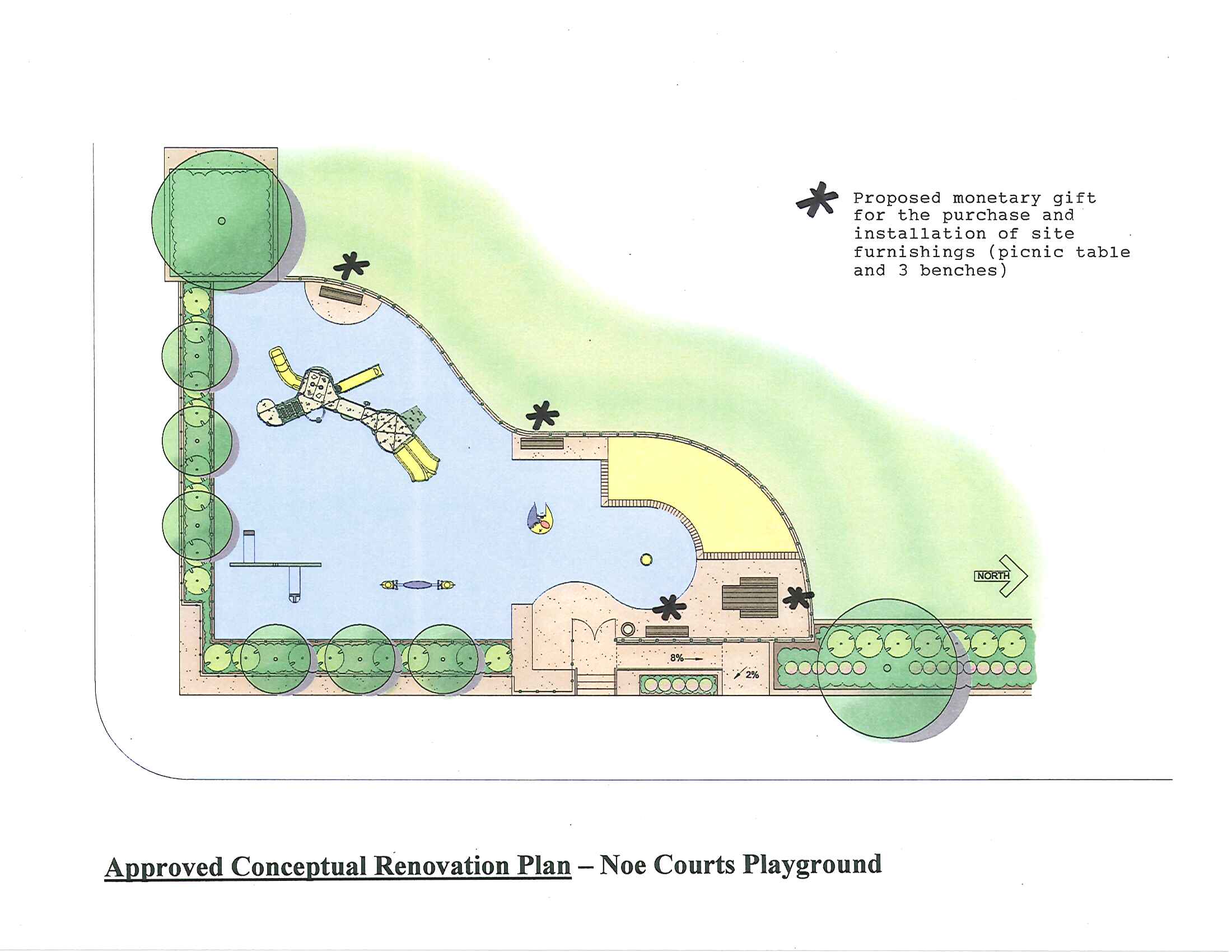 The Friends of Noe Courts applied for a Community Opportunity Fund grant for Phase I, which did not include the reconfiguration of the courts but did include irrigation upgrades, grading, and increased accessibility.