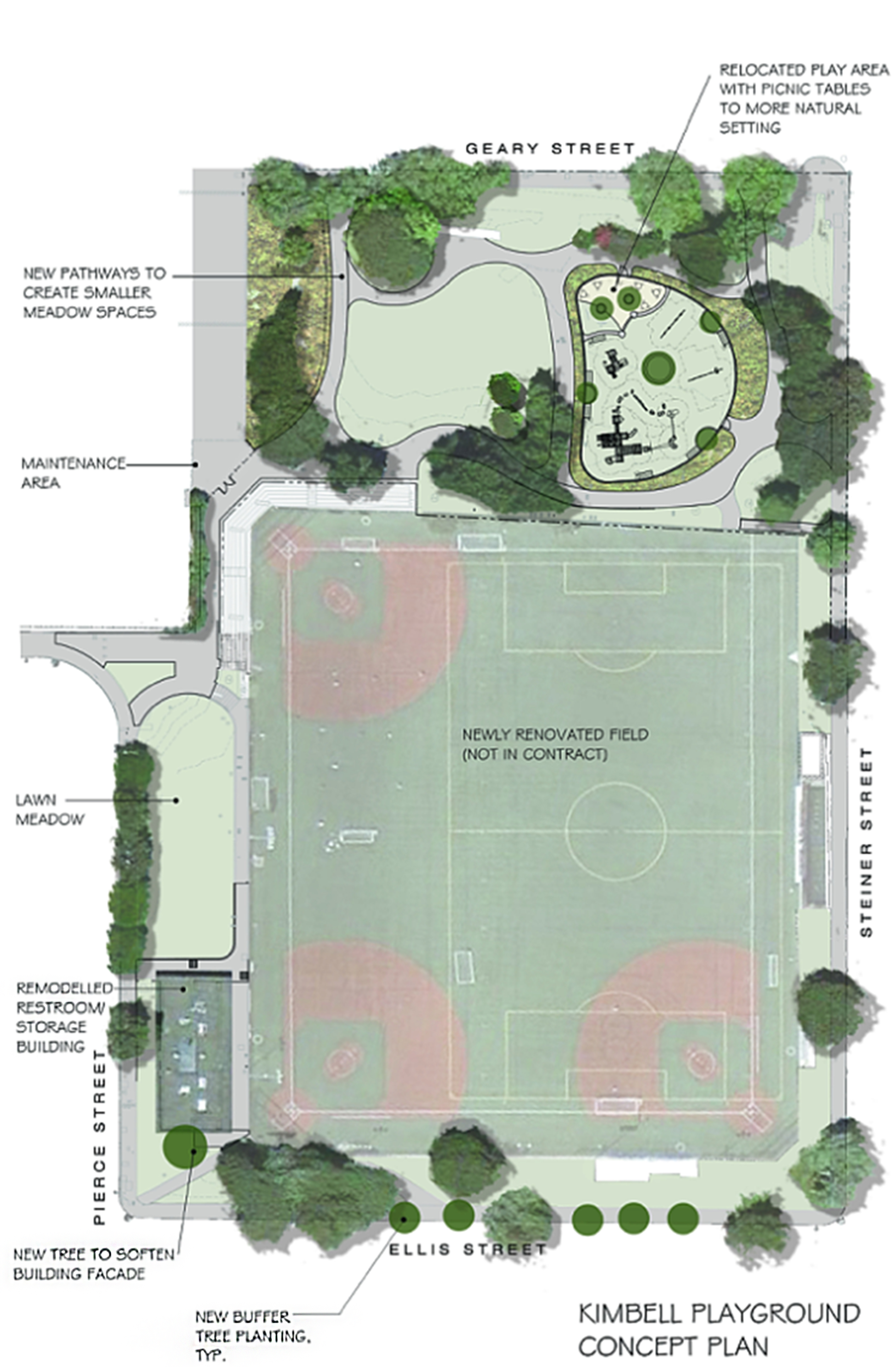Located at the corner of Geary Boulevard and Steiner Street, Raymond Kimbell serves a very urban part of San Francisco. The park offers a clubhouse, children's play area, three baseball fields with bleacher seating, and open green areas for visitors. Over the years, many of these facilities have become unusable, unsafe, and in need of repair. Our goal is to restore and improve Raymond Kimbell Playground for the benefit of its loyal community.