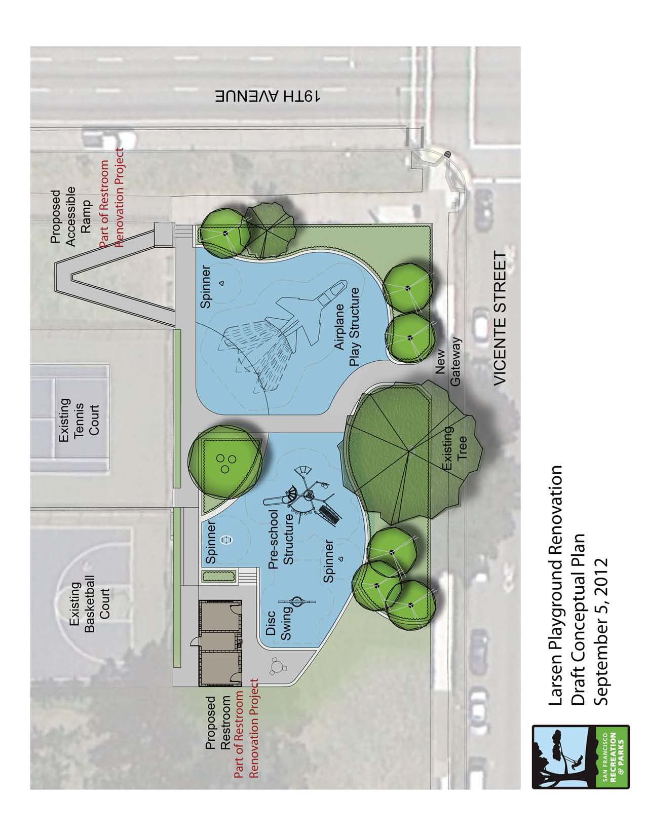 For years Larsen Park was known as "the airplane park" in reference to the decommissioned jet planes that served as play structures there from 1959 through 1993. The playground planes were highly visible to traffic along 19th Avenue, making the park a well-known landmark for the neighborhood. A heavily used play site for children for over thirty years, calls for replacing the jet in Larsen Park began almost with its removal in 1993. The playground that replaced the plane never received the attention or engagement of the neighborhood.