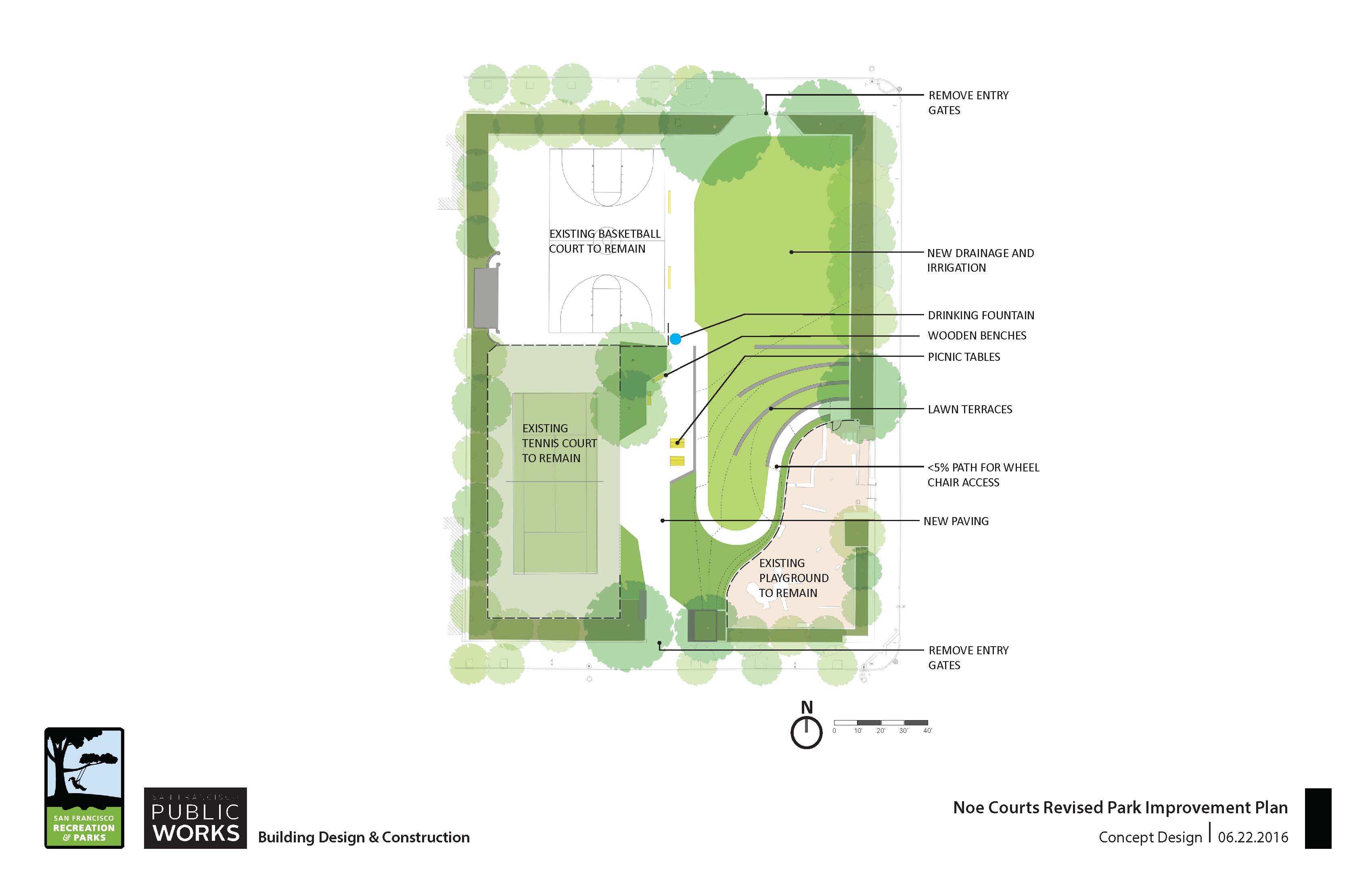 The Friends of Noe Courts applied for a Community Opportunity Fund grant for Phase I, which did not include the reconfiguration of the courts but did include irrigation upgrades, grading, and increased accessibility.