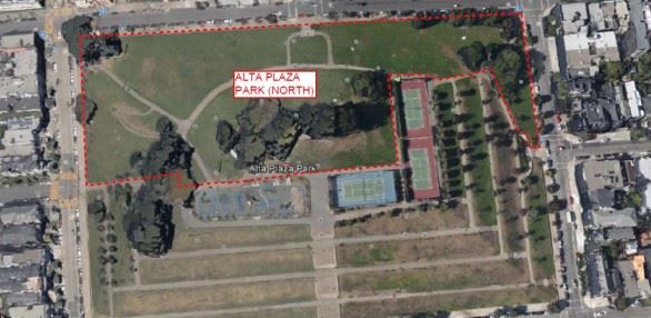 Alta Plaza Park has been identified by the San Francisco Public Utilities Commission (PUC) as having one of the highest losses of water, due to its antiquated irrigation system. The Park recently completed (in 2013) an irrigation replacement on the southern half of the Park. Prior to the completion of the 2013 project, no major renovation had been completed on the Park since its inception. This project affected the northern half of the park, as indicated by the red outlined area in the above photo.