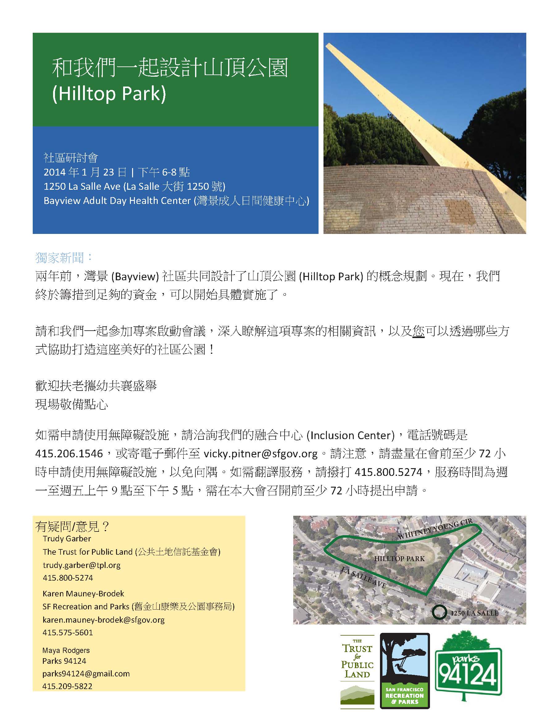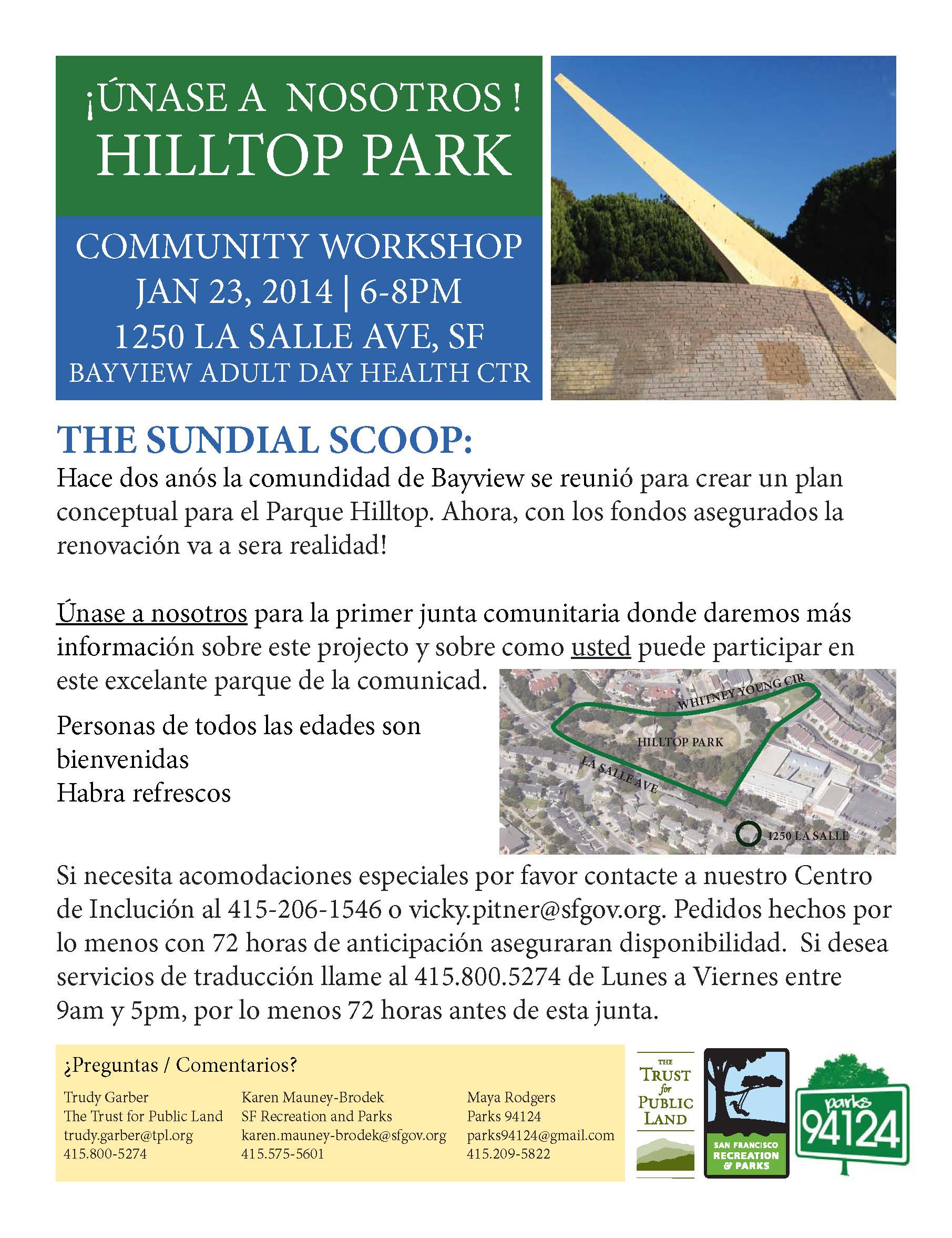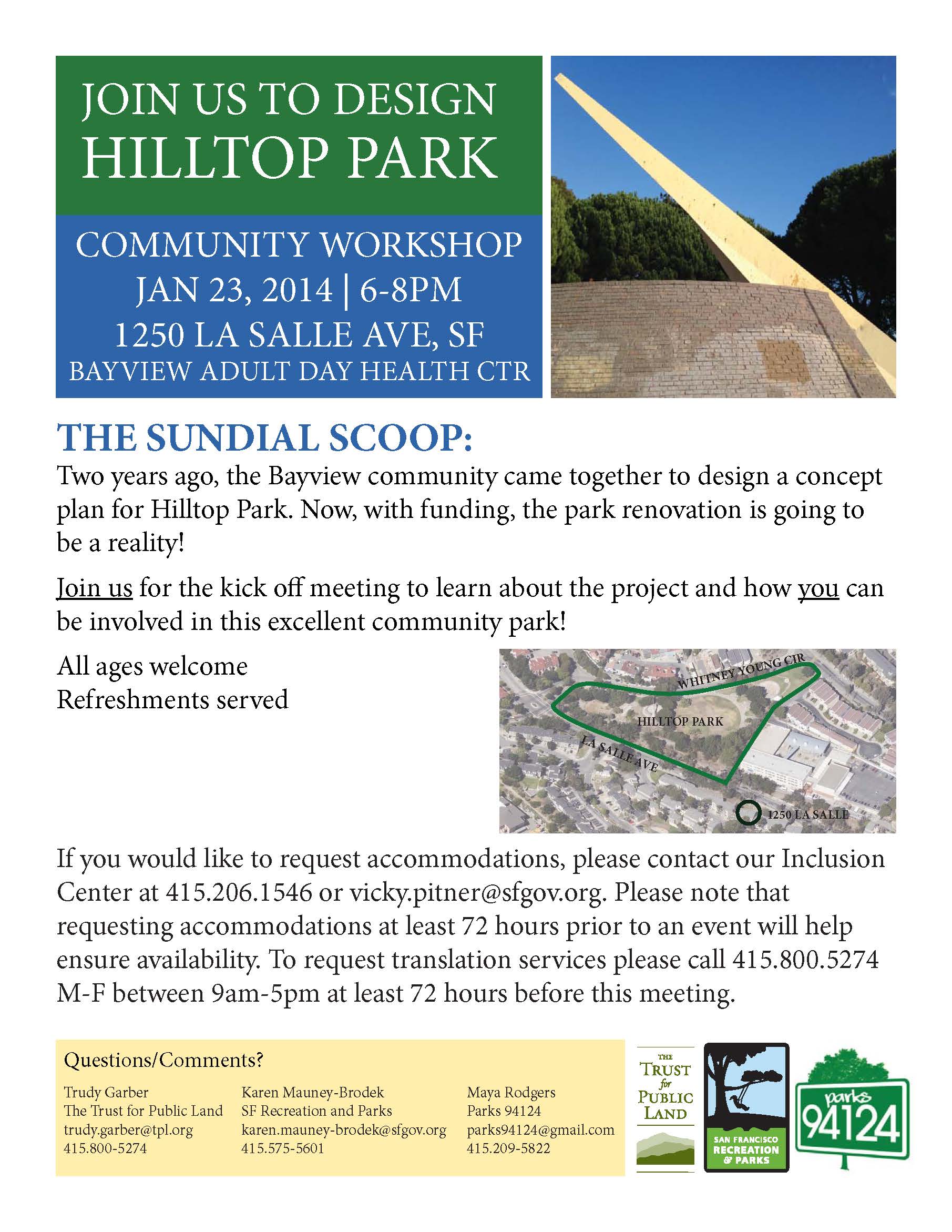 As part of the Trust for Public Land Parks for People initiative, in partnership with Rec and Park and Parks 94124 and with enthusiastic help from the community, undertook a complete renovation of Hilltop Park.